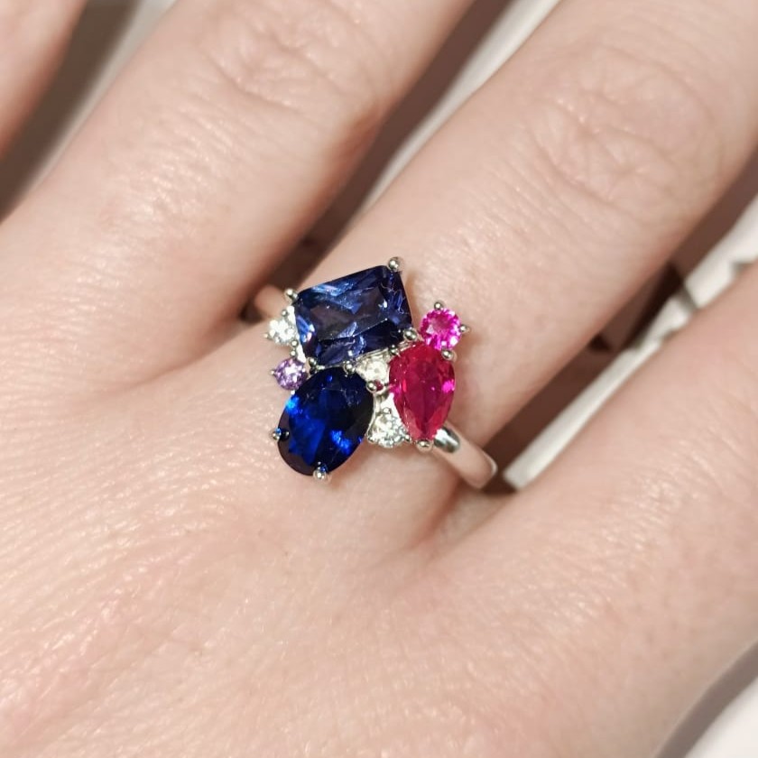 This striking sterling silver ring features a unique cluster of faceted cubic zircons in deep sapphire blue, vivid fuchsia, and brilliant clear tones.