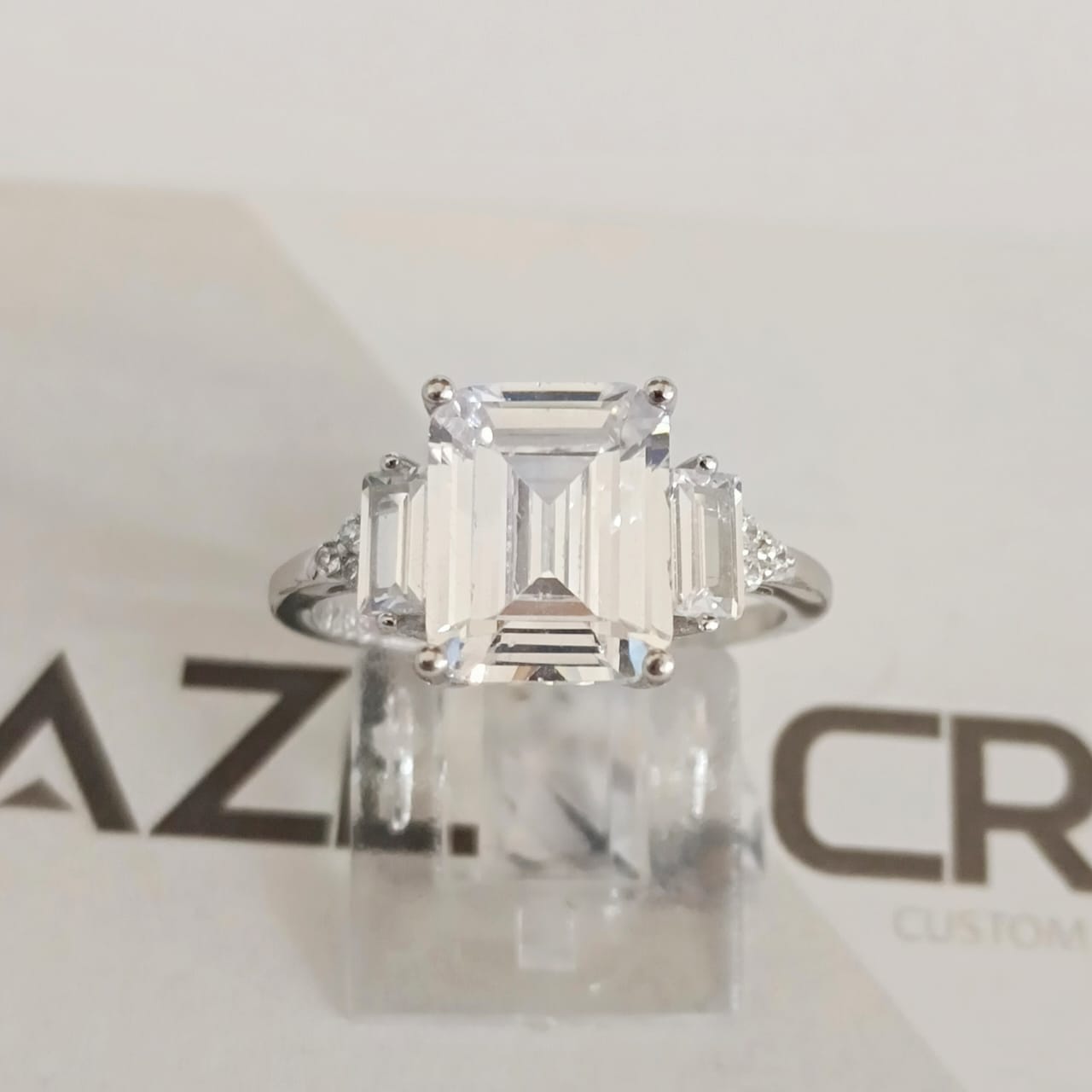 • Stones: Emerald-cut cubic zircon (10mm x 8mm) with baguette and round cubic accents