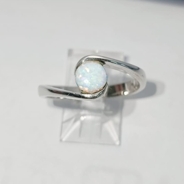 This handcrafted sterling silver ring features a luminous round opal set in a smooth, sculpted band. The gentle curve of the silver cradles the gem, highlighting its iridescent flashes of soft blues, greens, and pinks. Elegant and timeless, this piece evokes the calm beauty of moonlight with a modern minimalist twist.