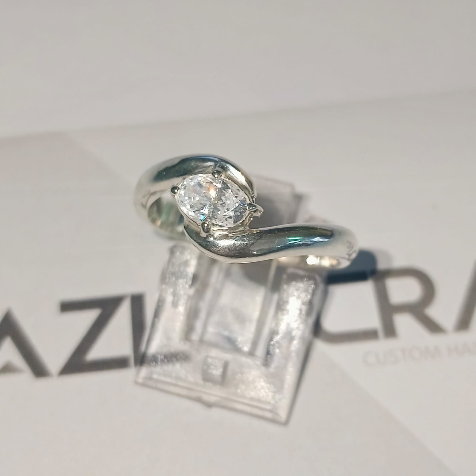 This handcrafted sterling silver ring features a sleek, twisting band that cradles a marquise-cut cubic zirconia. Minimal yet striking, it balances sculptural form with timeless elegance