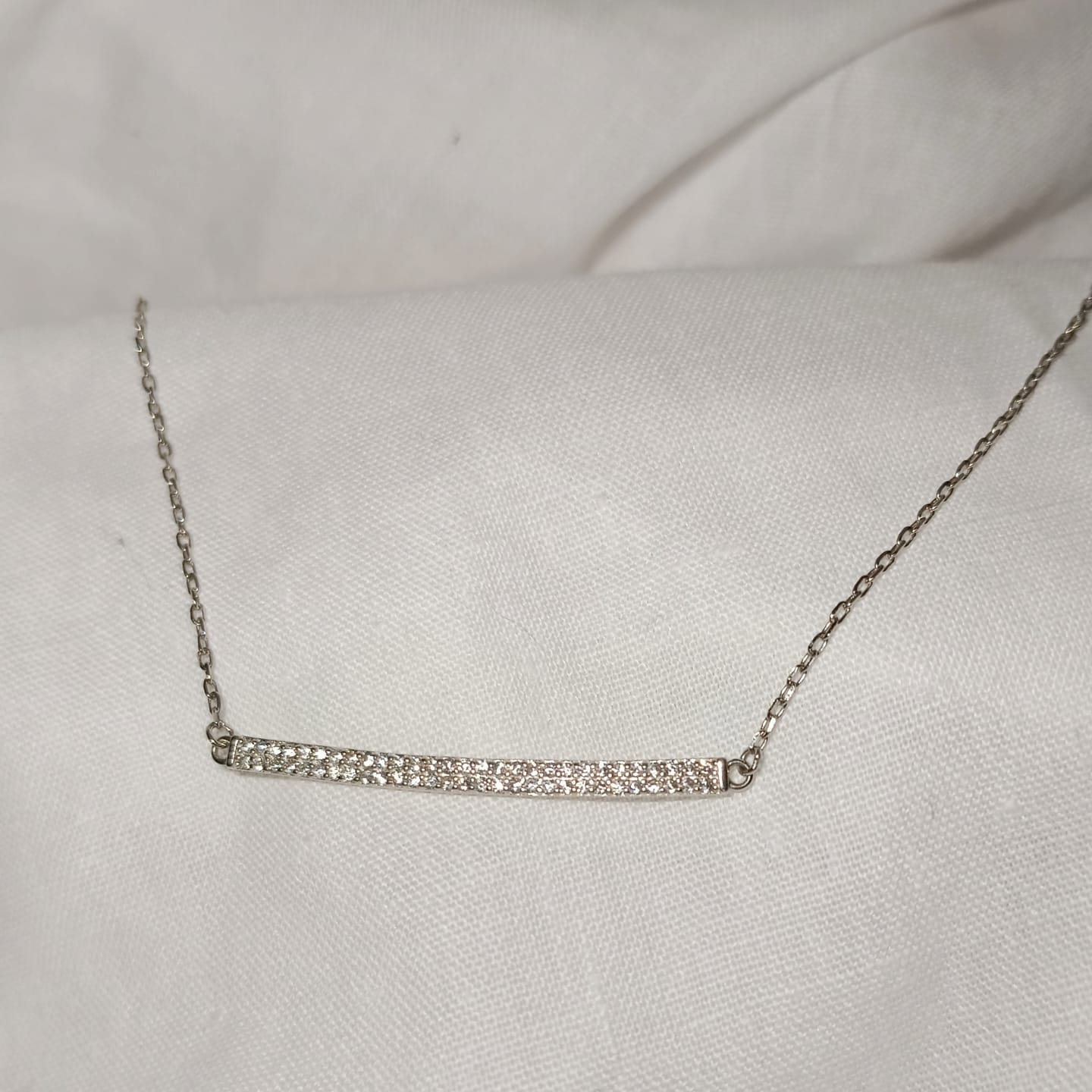 A refined sterling silver necklace featuring a sleek bar pendant adorned with rows of radiant cubic zirconias. The delicate shimmer adds a modern touch of luxury.