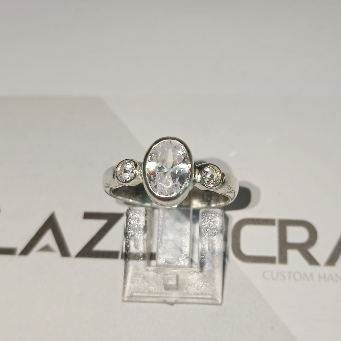 Handcrafted in sterling silver, this elegant ring features a brilliant oval-cut cubic zirconia at its center, complemented by two smaller round stones on either side. The smooth bezel settings and polished finish give it a refined, modern look that highlights the stones’ crisp sparkle while ensuring comfortable wear.